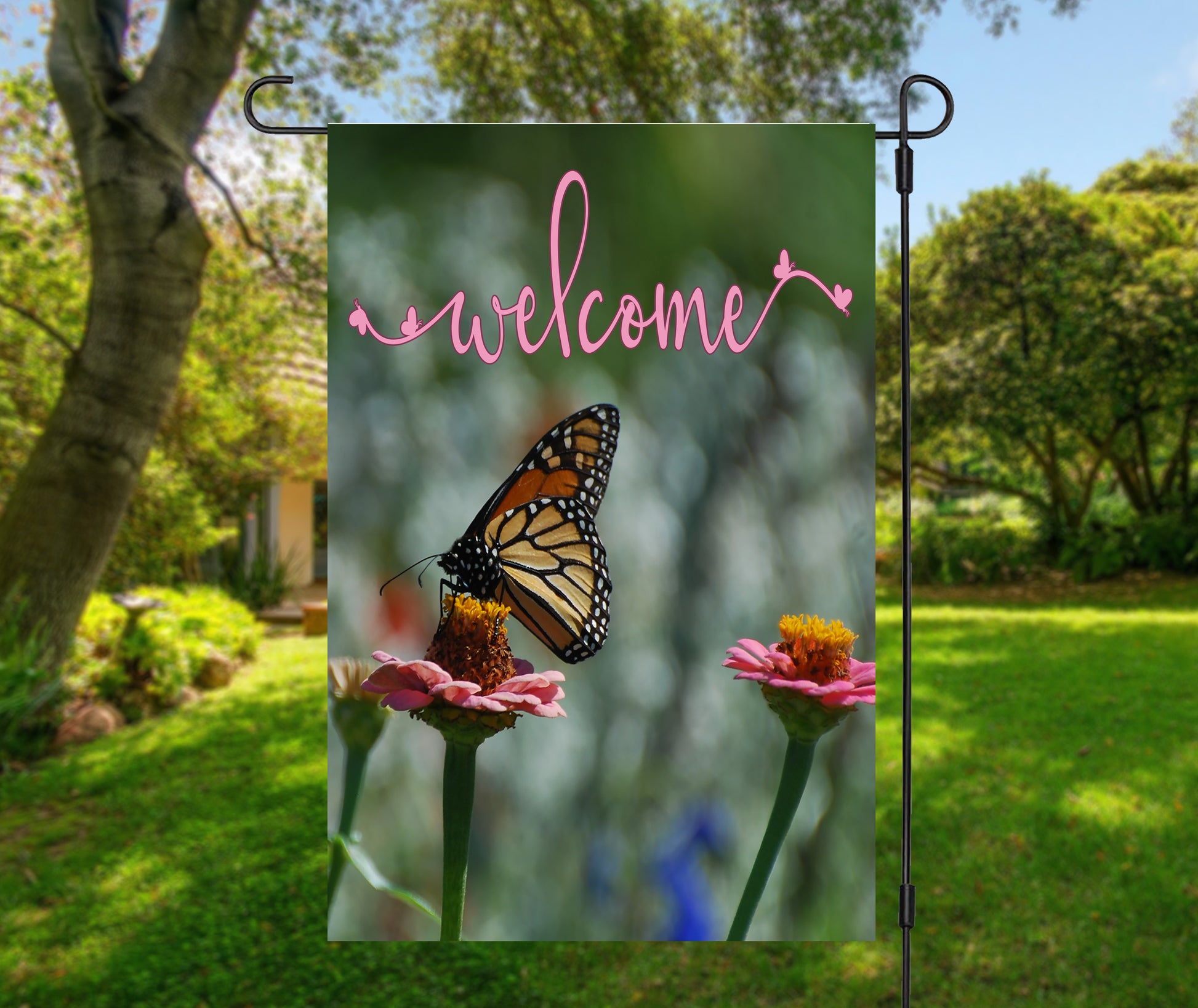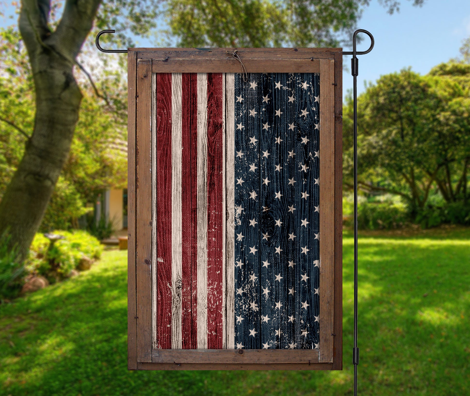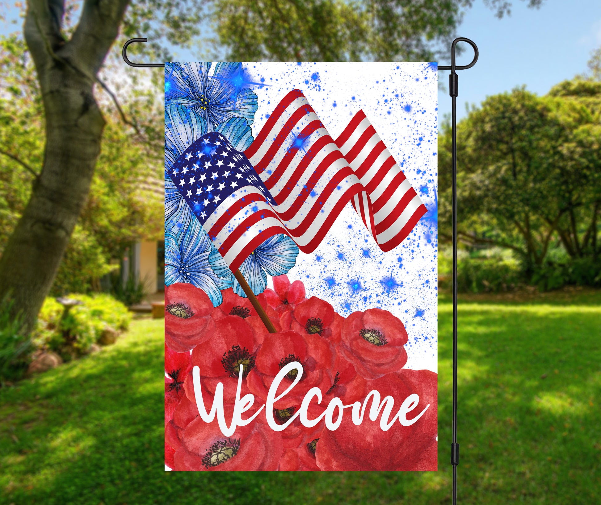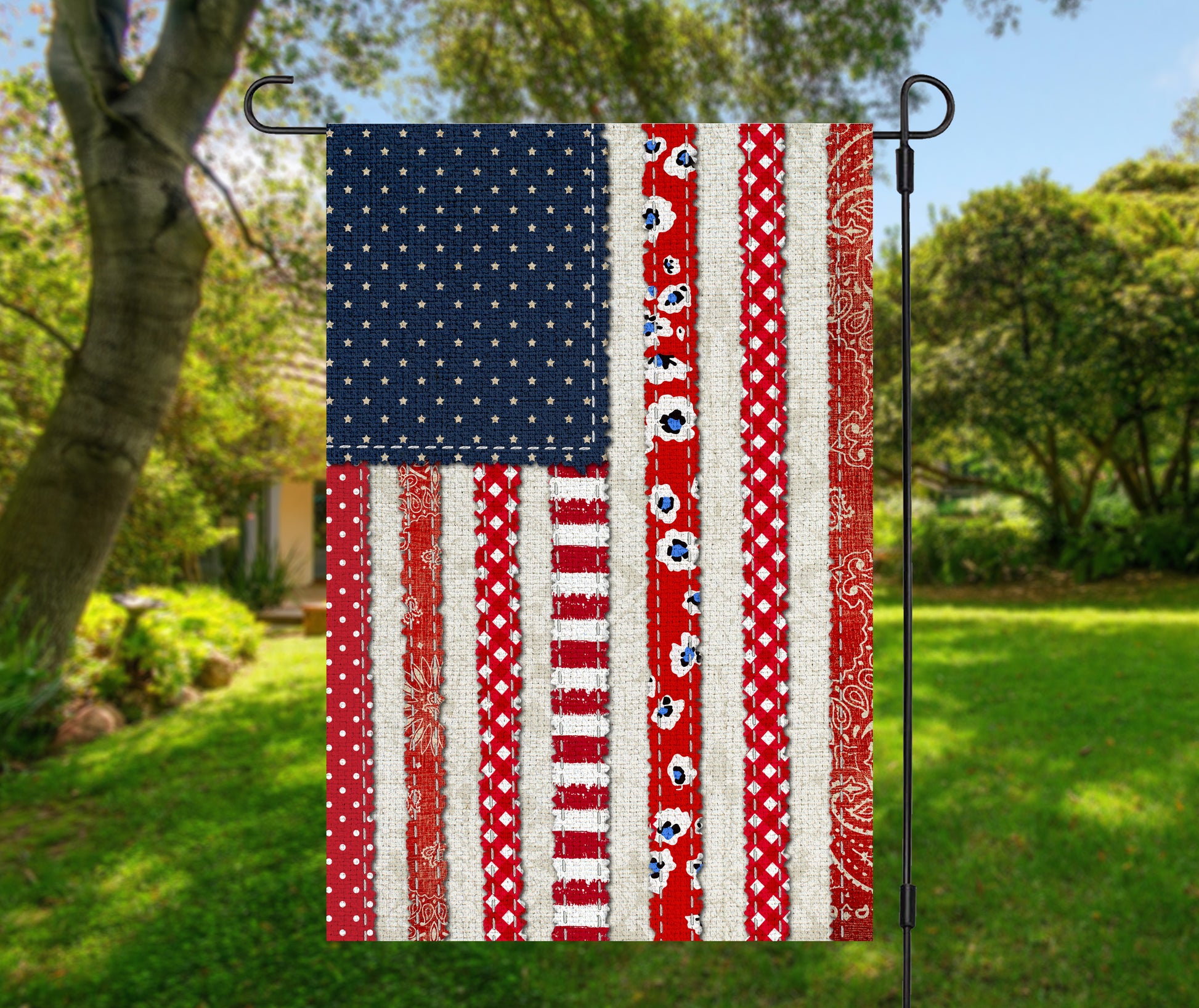 Garden Flag is made of 100% Polyester and is 12" wide x 18" long. Stake is not included.